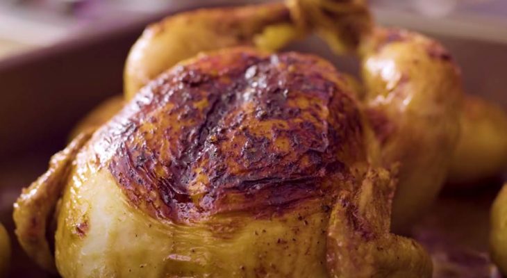 - Disponha o frango em uma assadeira grande junto com as batatas. Asse o frango no forno a 230 graus por 1 hora.